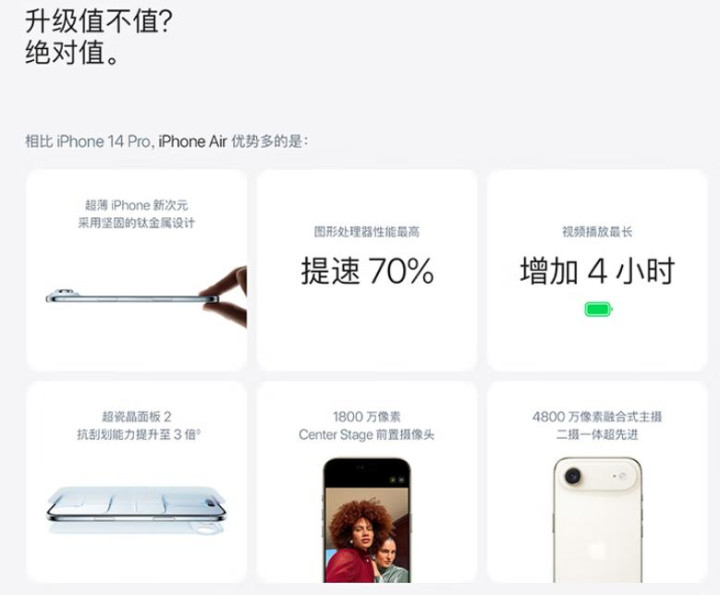 设计敏感型消费者容易被iPhone Air的外观吸引。四款精心调配的配色(深空黑色、云白色、浅金色和天蓝色)加上钛金属边框的质感,满足了用户对美学的追求。
